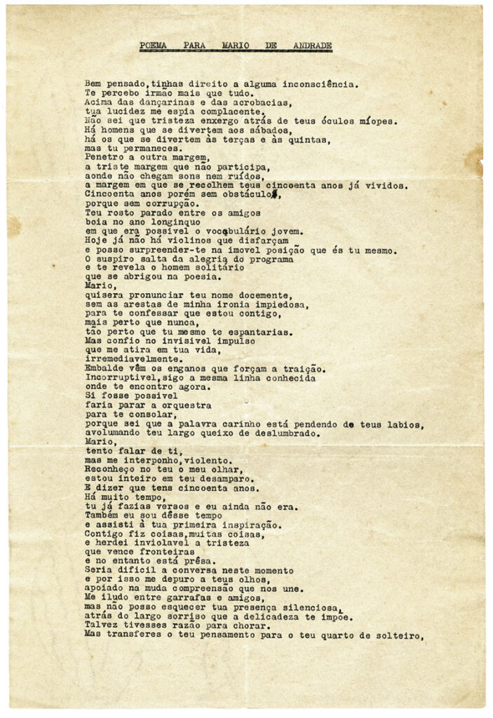 (Principiei impensadamente esta carta e fui obrigado a interromper pra ir almoçar.) Mas como eu ia falando, se há grande força lírica, se há boa força intelectual em vocês, o que me entusiasma é o grupo. Se eu fiquei querendo bem vocês, muito bem, bem leal, sem a menor espécie de interesse torvo, eu juro, embora disposto a batalhar por vocês me quererem sempre muito – bem interessadíssimo pois, mas só interessado do puro bem-querer –; e se noto meio assustado, meio interrogativo, que se quero bem a cada um de um jeito diferente – que isto é mesmo o problema mais misterioso do bem-que­rer, este querer bem que não é a mais ou a menos quando chega no ponto da amizade, mas é diferente –— e de todos os bem-quereres que eu trouxe, é você o que eu pressinto menos acidentado no futuro, mais possível de cami­nho calmo, sem reservas, sem inquietações, sem brigas, sem perigos (ao Paulo, por exemplo, eu quero bem com raiva; é o por quem, injustamente pra com todos os outros, eu mais prontamente me sacrificaria; é o que mais periga por ser o mais errado como atitude intelectual, embora como atitude sentimental, ou melhor: como exercício do sentimento talvez seja o mais certo)… Meu Deus! me perdi completamente! Deixo isto pra explicar depois. Onde eu queria chegar neste parágrafo era louvar o grupo que vocês fazem, pela força de cada um, pela diferença de cada um, pelo exercício da amizade que soube escolher sem por isso depender de nenhum estreito “espírito de grupo”. É preciso o espírito de grupo, isso é um bem grande, uma felicidade, um exercício digníssimo de vida humana, uma grave modéstia, e um con­forto sempre. E como eu invejo isso em vocês! Eu nunca tive isso em minha vida e sempre desejei isso. Talvez tenha sido o que mais me faltou. Mas me incorporar aos grupos de mais novos seria uma falsificação de tudo. Seria impossível, sobretudo, diante da lealdade natural das idades. E os meus com­panheiros de geração, guardo deles este ressentimento, ainda vinham oito­centistamente tão apegados ao exercício do individualismo, nesta terra sem tradições nem raciais nem culturais, que jamais pudemos viver os benefícios, os confortos, as forças do grupo. Vocês estão com muito melhores condições e por isso eu insisto em chamar a atenção de vocês sobre o vosso grupo. Vocês também não possuem tradições nem raciais nem culturais que permitam só por si o exercício do grupo. Mas já tem maior consciência dos coletivos, que o sofrimento deste tempo novo lhes dá. Vocês, eu vejo, eu sinto, já não estão enceguecidos pela mania vaidosa do exercício interior dos individua­listas. São individualistamente caracterizados, e tão diferentes mesmo uns dos outros, mas nesse exercício exterior do individualismo, que deriva das tendências pessoais e das convicções. O que eu chamo depreciativamente de exercício “interior” do individualismo, interior e menos profundo, era aquele em que vivíamos, nascido apenas da preliminar perniciosa de que era preciso ser diferente, já conseguia duvidar da torre de marfim, mas não pas­sava duma derivação dela, e propunha abertamente o slogan “nada de grupo! nada de escolas!”, feito sapos que se quisessem elefantes, gorgolejando “eu sou eu!”… Vocês precisam amar o vosso grupo e não será invejar demais se me ponho antes de mais nada amando o grupo de vocês e refazendo nele o que eu nunca pude ter. Não é inveja, é saudade.