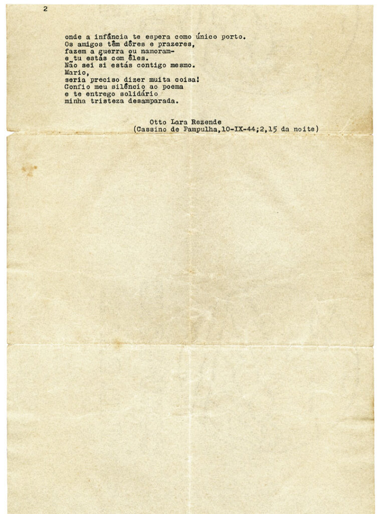 Deve ser isto que me leva a escrever primeiro a você: aquele seu dramático poema daquela noite… noite dramá­tica, estranhíssima, insolúvel e inqualificável (sem sentido pejorativo) no Cassino de Pampulha. Ah, Otto, pra que você foi perceber a minha tristeza lá dentro da minha… boa educação! Isso me fez um benefício doloroso, um mal admirável. Meu Deus! Nem é bem isso, eu não sei! A tristeza nem estava lá dentro, nem estava só em mim… Nem se disfarçava na boa educação de ninguém… Que noite estra­nha… Havia alegria também, havia principalmente prazer. Mas depois do desejo de estar ali que nos levou lá, no prazer de estar lá, é certo que quase todos nós, do nosso grupo, não queríamos estar ali. Estávamos angustiados. E será sempre impossível limitar toda a complexidade do motivo.