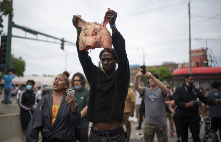 O homem ergue uma cabeça de porco, segurando-a pelas orelhas com suas próprias mãos, como se uma bandeira fosse. É um aviso. É também um amuleto. O registro, realizado em Minneapolis por Jeff Wheeler no segundo dia de protestos após o assassinato de George Floyd, tem circulado nas redes sociais ao lado de dezenas de fotografias de prédios em chamas e outras cenas impactantes das revoltas raciais que tomaram os EUA – e se espalharam feito pólvora pelo mundo.