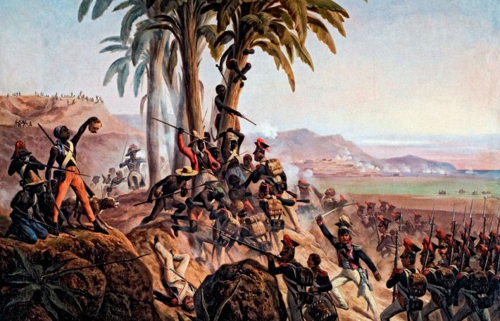 E remetem a outra imagem poderosa, embora menos conhecida. Trata-se de Bitwa in San Domingo (1845), tela do polonês January Suchodolski que projeta, algumas décadas depois, como teria se desenrolado uma das batalhas do processo de guerras de independência do Haiti. Processo que, na virada do século 18 para o 19, transformou a colônia açucareira mais lucrativa do império colonial francês no primeiro país do Novo Mundo a abolir a escravidão. A pintura, pouco afeita ao realismo dos fatos, não escapa do olhar colonial de seu contexto. Imagina um exército negro desorganizado, descamisado, portando armas rudimentares, em oposição a um exército europeu enfileirado, bem vestido, a cavalo. Do lado esquerdo da tela, um soldado negro, provavelmente ex-escravizado, empunha a cabeça de um homem branco – uma maneira de o pintor ilustrar a suposta selvageria e violência dos abolicionistas e independentistas da então ilha de São Domingos, cuja fama assustou a Europa e abalaria todo o sistema colonial, inspirando revoltas escravas no Caribe e no continente americano afora.